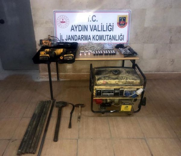 Aydın Germencik'te kırsal Çarıklar Mahallesi yakınlarındaki dağlık alanda, dün öğle saatlerinde kaçak kazı yapan A.K., Y.E.Ö., M.K., O.S., ve A.K. gözaltına alındı. Şüphelilerle birlikte jeneratör, matkap, kayaları patlatmak için dinamit ve fünye, demir kesme makası ve balyoz ele geçirildi. Yakalanan 5 şüpheli, jandarmadaki işlemlerinin ardından adliyeye sevk edildi. 5 şüpheli adli kontrol şartıyla serbest bırakıldı.
