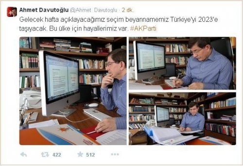 Başbakan Ahmet Davutoğlu, sosyal paylaşım sitesi Twitter’da çalışma ofisinde çekindiği 3 adet fotoğrafı paylaştı. Davutoğlu, fotoğrafların üzerine yazdığı yorumda, “Gelecek hafta açıklayacağımız seçim beyannamemiz Türkiye’yi 2023’e taşıyacak. Bu ülke için hayallerimiz var” ifadelerini kullandı.