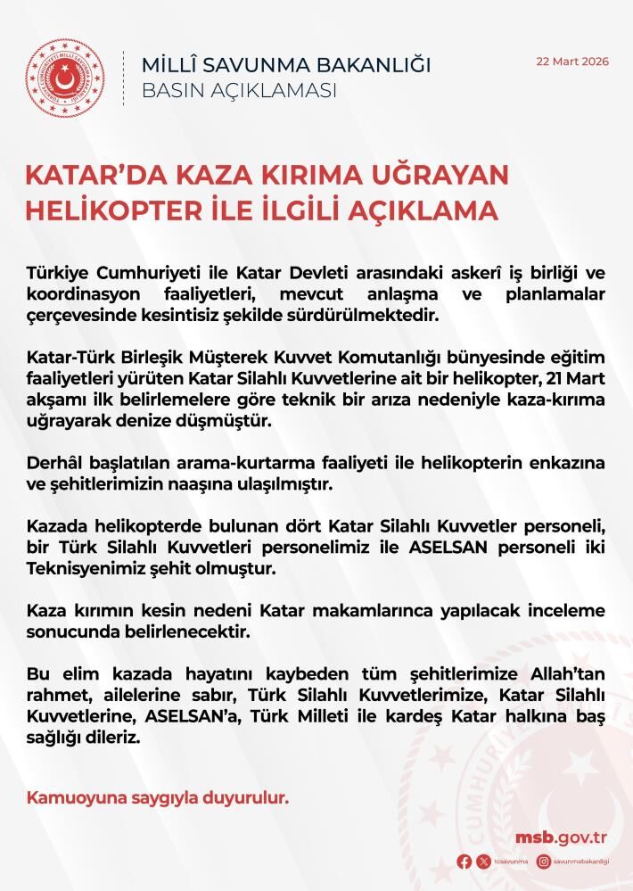 MSB’den yapılan yazılı açıklamada, Türkiye ile Katar arasındaki askeri iş birliği faaliyetlerinin sürdüğüne dikkat çekilirken, Katar-Türk Birleşik Müşterek Kuvvet Komutanlığı bünyesinde eğitim faaliyetleri kapsamında görev yapan bir helikopterin kaza yaptığı aktarıldı. Açıklamada, "Katar-Türk Birleşik Müşterek Kuvvet Komutanlığı bünyesinde eğitim faaliyetleri yürüten Katar Silahlı Kuvvetlerine ait bir helikopter, 21 Mart akşamı ilk belirlemelere göre teknik bir arıza nedeniyle kaza-kırıma uğrayarak denize düşmüştür. Derhal başlatılan arama-kurtarma faaliyeti ile helikopterin enkazına ve şehitlerimizin naaşına ulaşılmıştır" ifadeleri kullanıldı.