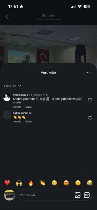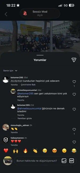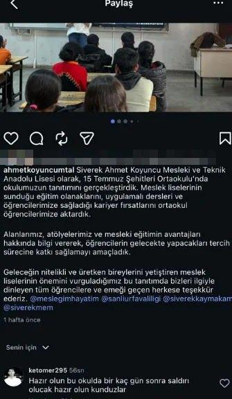 Saldırıyı gerçekleştiren Ömer Ket'in okulun Instagram hesabındaki paylaşıma tehdit içerikli yorum yaptığı ortaya çıktı: