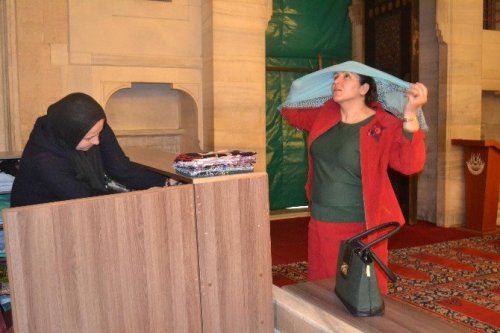 Müftü Üzüm, özellikle yaz aylarında kısa etek ya da şort gibi kıyafetlerle gelen kadın ziyaretçilere de tesettür elbiseleri verdiklerini belirterek, "Bu çeşit ziyaretçilerimiz, şüphesiz caminin girişindeki adaba uygun bir şekilde, cami adabına uygun bir şekilde girmeleri için hem tek kullanımlık başörtü veriyoruz. Hem de tesettür kıyafeti veriyoruz. Bu bütün dünyada da böyle uygulanıyor. Bu durum batı da böyledir. İbadethanelere girerken saygı içerisinde olmak için tesettür kıyafetleri giyiliyor" dedi.